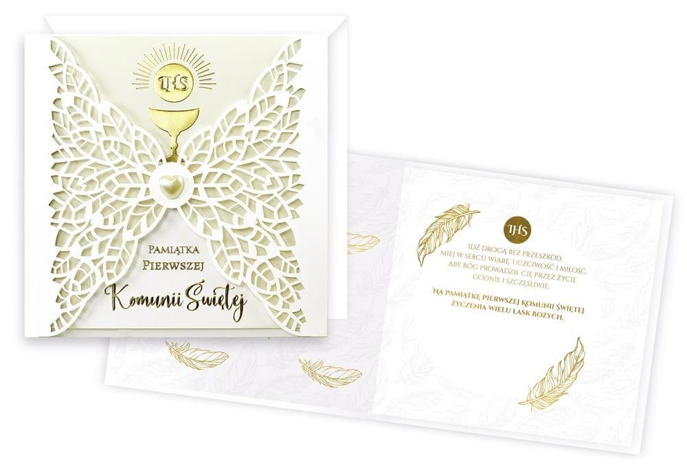 Kartki z serii Primus, to kartki najwyższej jakości, pięknie zdobione m.in złotą lub srebrną folią, tłoczeniami, czy wycinkami laserowymi. Idealne na najważniejsze okazje w życiu, takie jak ślub, komunia. W środku każdej kartki znajdują się dobrane do okazji życzenia, a do kartki dołączona jest dopasowana koperta. Cechy szczególne: wielkość: niestandardowa, prostokątna, kwadratowa, zdobienia: dekoracje ze złotej folii, doklejane koraliki, tłoczenia koperta: dopasowana w komplecie, wnętrze kartki: życzenia w środku, okazja: komunia