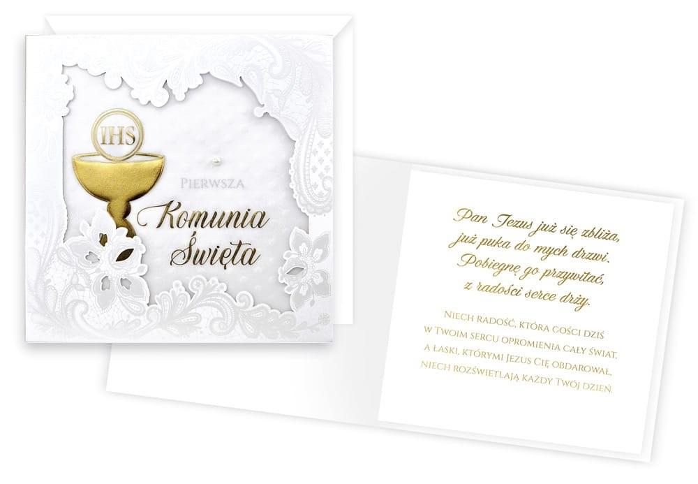 Kartki z serii Primus, to kartki najwyższej jakości, pięknie zdobione m.in złotą lub srebrną folią, tłoczeniami, czy wycinkami laserowymi. Idealne na najważniejsze okazje w życiu, takie jak ślub, komunia. W środku każdej kartki znajdują się dobrane do okazji życzenia, a do kartki dołączona jest dopasowana koperta. Cechy szczególne: wielkość: niestandardowa, prostokątna, kwadratowa, zdobienia: dekoracje ze złotej folii, doklejane koraliki, tłoczenia koperta: dopasowana w komplecie, wnętrze kartki: życzenia w środku, okazja: komunia