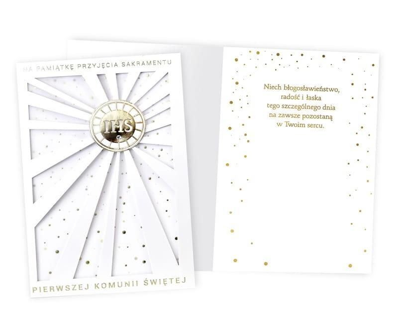 Kartki z serii Primus, to kartki najwyższej jakości, pięknie zdobione m.in złotą lub srebrną folią, tłoczeniami, czy wycinkami laserowymi. Idealne na najważniejsze okazje w życiu, takie jak ślub, komunia. W środku każdej kartki znajdują się dobrane do okazji życzenia, a do kartki dołączona jest dopasowana koperta. Cechy szczególne: wielkość: niestandardowa, prostokątna, kwadratowa, zdobienia: dekoracje ze złotej folii, doklejane koraliki, tłoczenia koperta: dopasowana w komplecie, wnętrze kartki: życzenia w środku, okazja: komunia