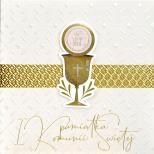 Kartka Primus 0215 Komunia Kartki z serii Primus, to kartki najwyższej jakości, pięknie zdobione m.in złotą lub srebrną folią, tłoczeniami, czy wycinkami laserowymi. Idealne na najważniejsze okazje w życiu, takie jak ślub, komunia. W środku każdej kartki znajdują się dobrane do okazji życzenia, a do kartki dołączona jest dopasowana koperta. Cechy szczególne: wielkość: niestandardowa, prostokątna, kwadratowa, zdobienia: dekoracje ze złotej folii, doklejane koraliki, tłoczenia koperta: dopasowana w komplecie, wnętrze kartki: życzenia w środku, okazja: komunia