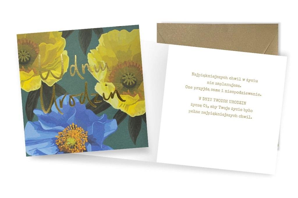 Kartka z serii Quadro to idealny pomysł na piękną pamiątkę. Każda kartka QRP zdobiona jest złotą folią oraz wyróżnia się przepięknym kwiatowym motywem na froncie. Środek kartki posiada specjalnie dopasowane życzenia z miejscem na własną dedykację. Całość idealnie dopełnia dopasowana kolorystycznie koperta Cechy szczególne: wielkość: 15.5 x 15.5 cm po złożeniu koperta: dopasowana koperta kraft zdobienia: złota folia okazja: urodziny
