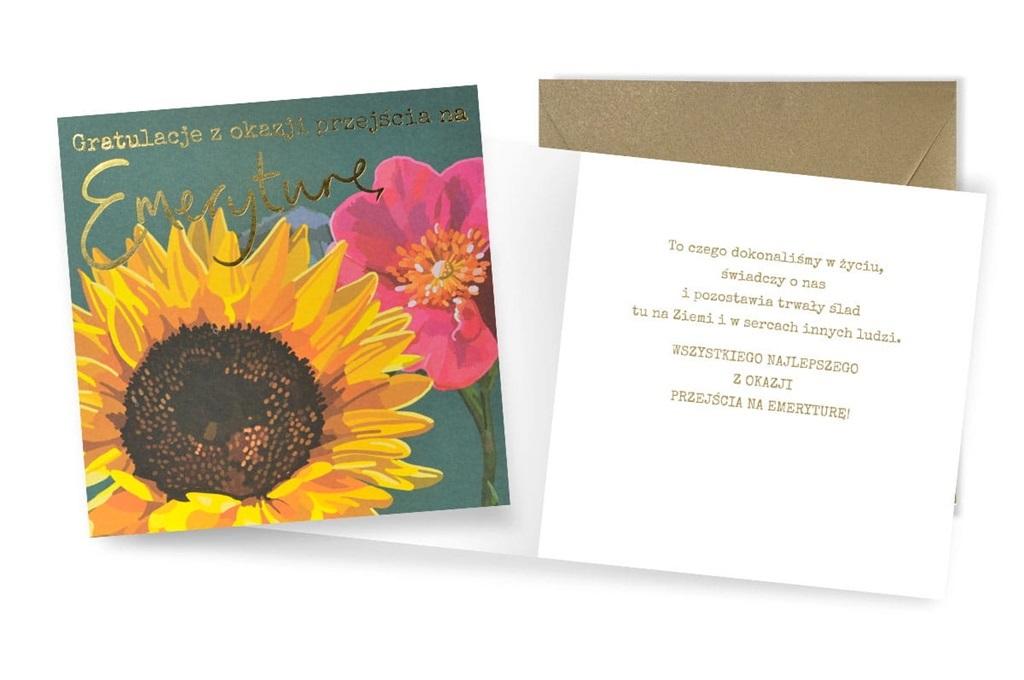 Kartka z serii Quadro to idealny pomysł na piękną pamiątkę. Każda kartka QRP zdobiona jest złotą folią oraz wyróżnia się przepięknym kwiatowym motywem na froncie. Środek kartki posiada specjalnie dopasowane życzenia z miejscem na własną dedykację. Całość idealnie dopełnia dopasowana kolorystycznie koperta Cechy szczególne: wielkość: 15.5 x 15.5 cm po złożeniu koperta: dopasowana koperta kraft zdobienia: złota folia okazja: emerytura