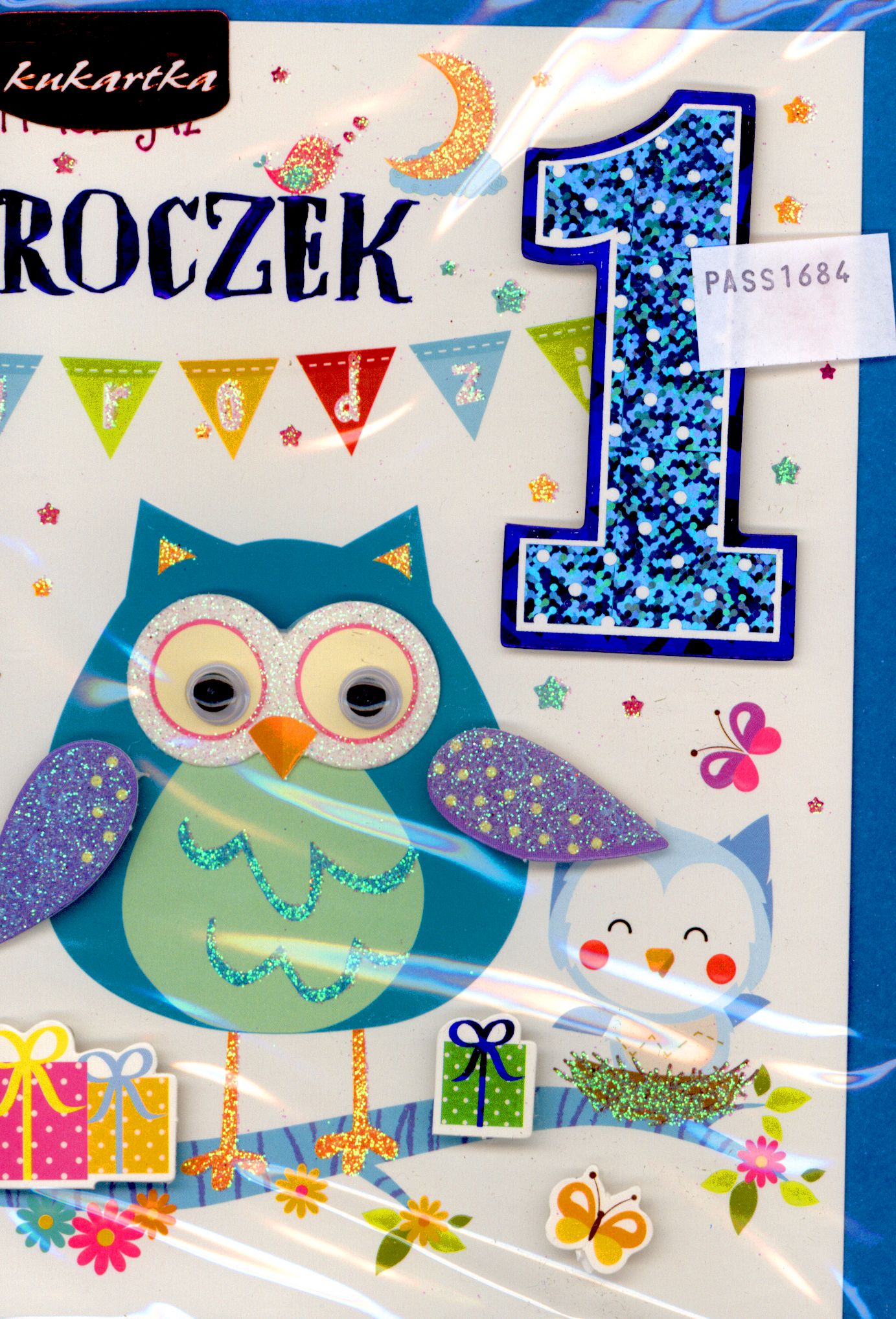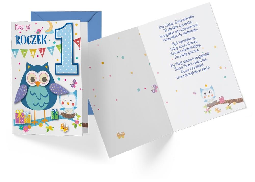 Kartka B6 z ozdobnej serii Dream Cards z sową na roczek - nieduża, ale robi wrażenie dzięki atrakcyjnej kolorystyce i ciekawym zdobieniom. To idealny wybór łączący przyjazną cenę z jakością. Cechy szczególne: wielkość: B6, 16.6 x 11.7 cm po złożeniu, koperta: w zestawie, kolorowa, zdobienia: różnorodne, bogate (w zależności od wzoru: przyklejane dekoracje, elementy biżuteryjne, odstawniki, brokat metaliczne folie, tłoczenia itp.), okazja: roczek, 1 urodziny