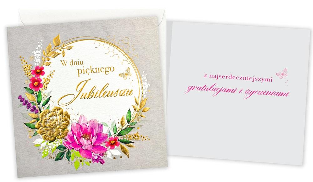 Kartka z serii Quadro to idealny pomysł na pamiątkę jubileuszu. Kartki wyróżniają się nowoczesnym designem przedstawionym w prostej formie. Środek każdej kartki posiada specjalnie dopasowane życzenia z miejscem na własną dedykację. Całość idealnie dopełnia koperta zaprojektowana z dbałością o każdy detal pasujący do kartki. Cechy szczególne: wielkość: 15.5 x 15.5 cm po złożeniu koperta: stylistycznie dopasowana do kartki zdobienia: połyskująca folia okazja: jubileusz