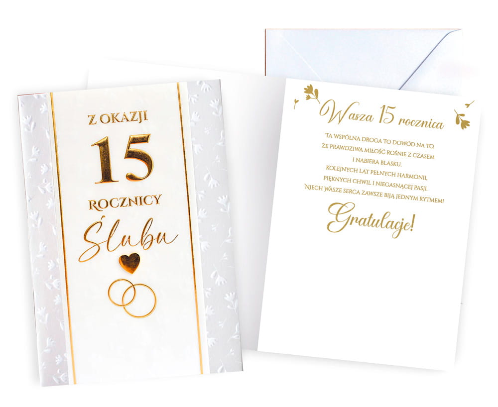 Kartka Dream Cards "Z okazji 15. rocznicy ślubu" DK-1336 Kartka B6 z ozdobnej serii Dream Cards - nieduża, ale robi wrażenie dzięki atrakcyjnej kolorystyce i ciekawym zdobieniom. To idealny wybór łączący przyjazną cenę z jakością. Cechy szczególne: wielkość: B6, 16.6 x 11.7 cm po złożeniu, koperta: w zestawie, kolorowa, zdobienia: kolorowe, różnorodne, bogate (w zależności od wzoru: przyklejane dekoracje, elementy biżuteryjne, odstawniki, metaliczne folie, tłoczenia itp.), okazja: Rocznica
