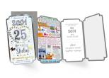 zdobienie: przynajmniej dwie folie (metaliczne/perłowe/holograficzne), elementy doklejane, wycięcia laserowe, wstążeczki - w zależności od wzoru,