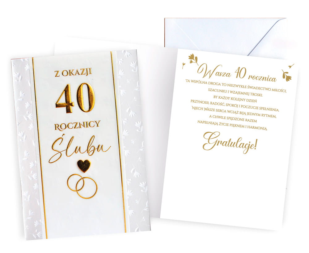 Kartka Dream Cards "Z okazji 40. rocznicy ślubu" DK-1341 Kartka B6 z ozdobnej serii Dream Cards - nieduża, ale robi wrażenie dzięki atrakcyjnej kolorystyce i ciekawym zdobieniom. To idealny wybór łączący przyjazną cenę z jakością. Cechy szczególne: wielkość: B6, 16.6 x 11.7 cm po złożeniu, koperta: w zestawie, kolorowa, zdobienia: kolorowe, różnorodne, bogate (w zależności od wzoru: przyklejane dekoracje, elementy biżuteryjne, odstawniki, metaliczne folie, tłoczenia itp.), okazja: Rocznica