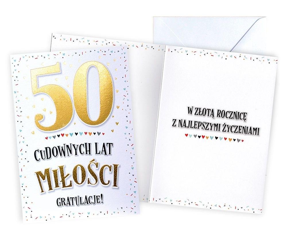 Kartka w powiększonym tzw. Angielskim formacie 140x190 mm. Wykonana z niezwykłą dbałością o szczegóły, zdobiona metalizowaną folią. W środku kartki znajduje się krótki tekst z życzeniami, a pod spodem jest miejsce na własną dedykację. w komplecie: dopasowana kolorystycznie koperta. okazja: Rocznica ślubu