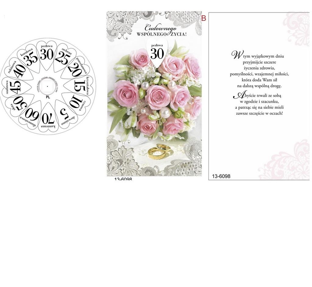 Zestaw karnet okolicznościowy z kopertą Rocznica Ślubu. Zawiera pięknie zdobiony karnet z możliwością ustawienia rocznicy (5 drewniana, 10 cynowa, 15 kryształowa, 20 porcelanowa, 25 srebrna, 30 perłowa , 35 koralowa, 40 rubinowa, 45 szafirowa, 50 złota, 60 diamentowa, 70 kamienna) oraz kopertę. Wymiary: 11,5x 19 cm