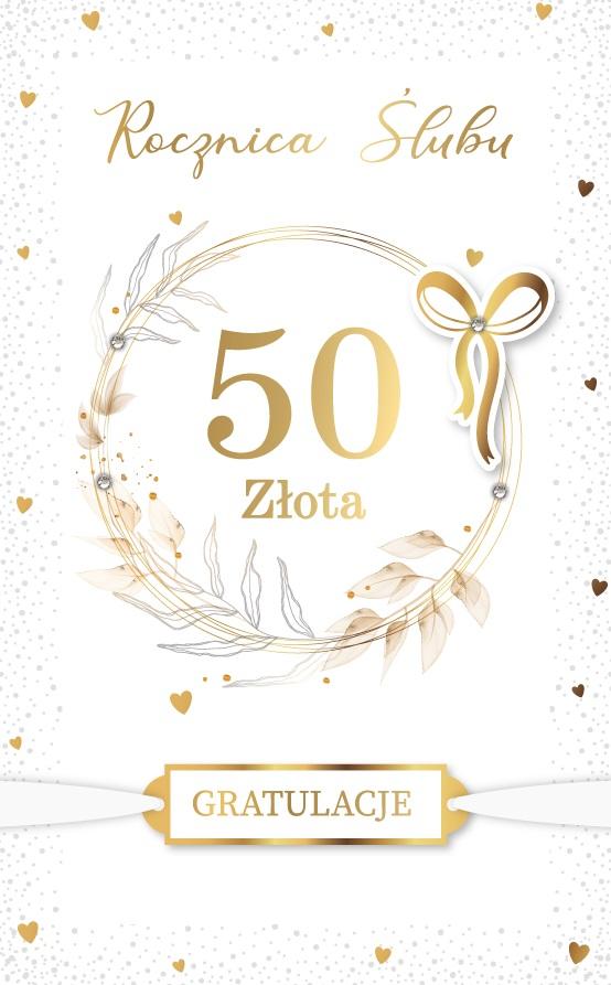 Luksusowy Karnet 50 Rocznica Ślubu, z elementami złocenia lub srebrzenia, wykonany na specjalnym, grubym kartonie z licznymi dodatkami.