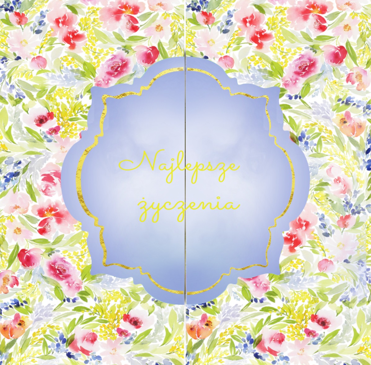 Karnet w formacie 15x15 cm, złocony, rozkładany. W zestawie z kolorową kopertą.