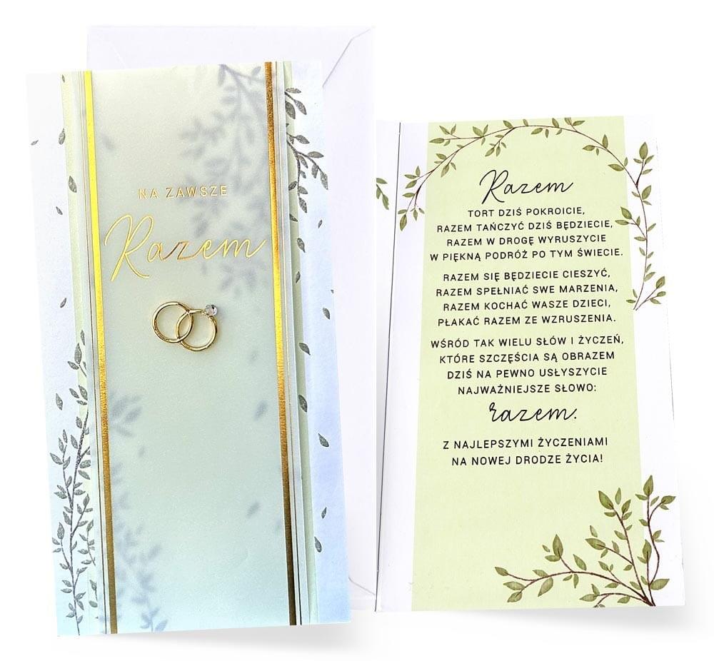 Każda kartka w kolekcji Passion Moments to małe arcydzieło - wyjątkowe i niepowtarzalne, piękne wizualnie. Kartki PM są bardzo bogato zdobione, a jednocześnie skromne i stylowe, cały efekt tkwi w detalach i doskonałym wykonaniu. W zależności od wzoru, na kartkach znajdują się dekoracje ze złotej, srebrnej, perłowej lub holograficznej folii, a także doklejki biżuteryjne, kokardki, brokat, laserowe wycięcia, wstążeczki i inne dodatki. Wnętrze karnetu to zawsze atrakcyjna grafika i tekst życzeń. Kartki mają w komplecie dopasowaną kopertę. Cechy szczególne: zdobienie: przynajmniej dwie folie (metaliczne/perłowe/holograficzne), brokat, elementy doklejane, wycięcia laserowe, wstążeczki - w zależności od wzoru, wnętrze: z delikatną grafiką, wyjątkowe życzenia w środku, w komplecie: dopasowana kolorystycznie koperta, okazja: Ślub Wymiary karnetu po złożeniu: 11,4 x 21,5 cm.