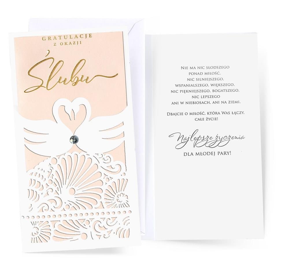 Każda kartka w kolekcji Passion Moments to małe arcydzieło - wyjątkowe i niepowtarzalne, piękne wizualnie. Kartki PM są bardzo bogato zdobione, a jednocześnie skromne i stylowe, cały efekt tkwi w detalach i doskonałym wykonaniu. W zależności od wzoru, na kartkach znajdują się dekoracje ze złotej, srebrnej, perłowej lub holograficznej folii, a także doklejki biżuteryjne, kokardki, brokat, laserowe wycięcia, wstążeczki i inne dodatki. Wnętrze karnetu to zawsze atrakcyjna grafika i tekst życzeń. Kartki mają w komplecie dopasowaną kopertę. Cechy szczególne: zdobienie: przynajmniej dwie folie (metaliczne/perłowe/holograficzne), brokat, elementy doklejane, wycięcia laserowe, wstążeczki - w zależności od wzoru, wnętrze: z delikatną grafiką, wyjątkowe życzenia w środku, w komplecie: dopasowana kolorystycznie koperta, okazja: Ślub Wymiary karnetu po złożeniu: 11,4 x 21,5 cm.