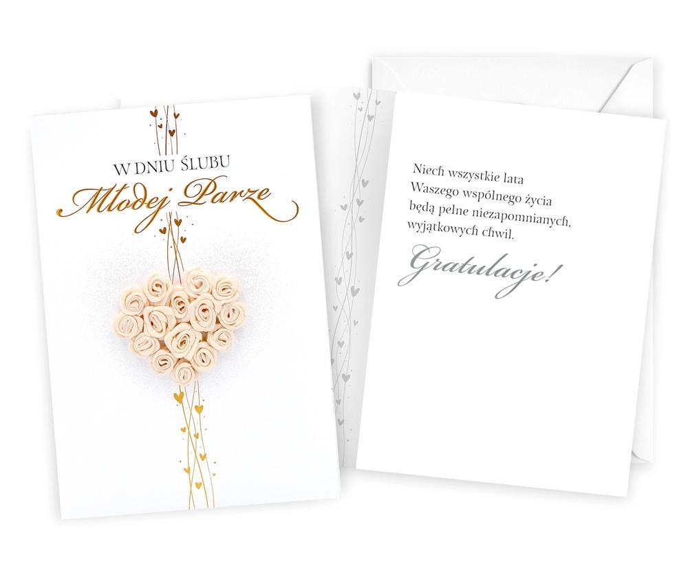 Kartka Dream Cards "W dniu ślubu Młodej Parze" DK-1233 Kartka B6 z ozdobnej serii Dream Cards na urodziny z wymiennymi cyframi - nieduża, ale robi wrażenie dzięki atrakcyjnej kolorystyce i ciekawym zdobieniom. To idealny wybór łączący przyjazną cenę z jakością. Cechy szczególne: wielkość: B6, 16.6 x 11.7 cm po złożeniu, koperta: w zestawie, kolorowa, zdobienia: kolorowe, różnorodne, bogate (w zależności od wzoru: przyklejane dekoracje, elementy biżuteryjne, odstawniki, metaliczne folie, tłoczenia itp.), okazja: Ślub