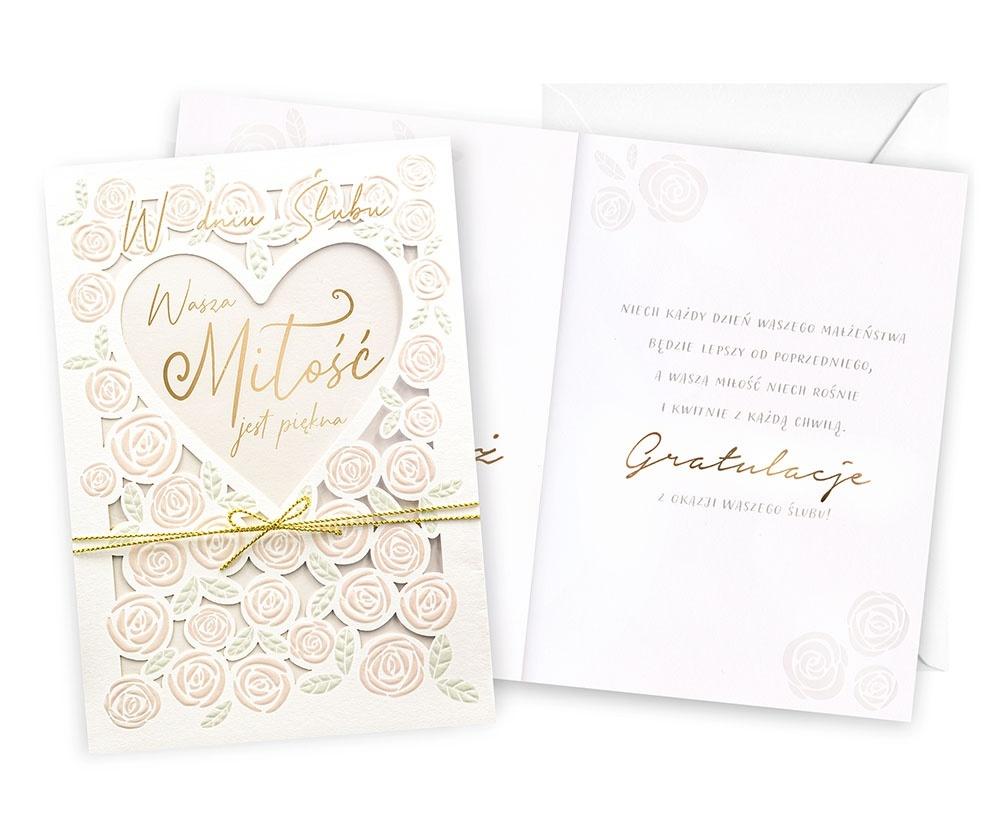Kartka Dream Cards na Ślub DK-1322 Kartka B6 z ozdobnej serii Dream Cards - nieduża, ale robi wrażenie dzięki atrakcyjnej kolorystyce i ciekawym zdobieniom. To idealny wybór łączący przyjazną cenę z jakością. Cechy szczególne: wielkość: B6, 16.6 x 11.7 cm po złożeniu, koperta: w zestawie, kolorowa, zdobienia: kolorowe, różnorodne, bogate (w zależności od wzoru: przyklejane dekoracje, elementy biżuteryjne, odstawniki, metaliczne folie, tłoczenia itp.), okazja: Ślub