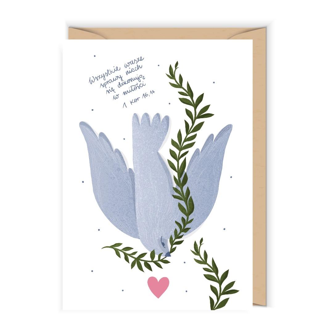 Otwierana kartka, pusta w środku, wykonana na papierze (z certyfikatem EFC) z wyraźnie widoczną fakturą. W zestawie ekologiczna koperta.