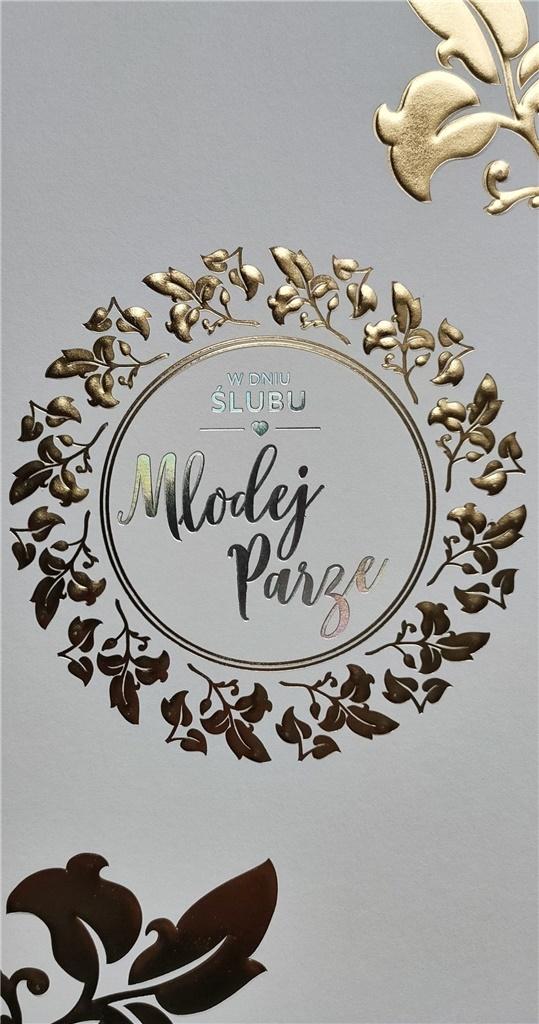 Bogato zdobiony karnet na ślub. Karnet wewnątrz zawiera życzenia.