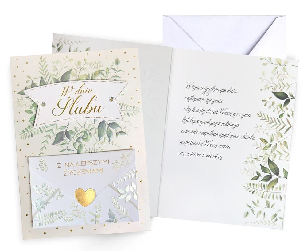Kartka Dream Cards "W dniu ślubu" DK-1314 Kartka B6 z ozdobnej serii Dream Cards - nieduża, ale robi wrażenie dzięki atrakcyjnej kolorystyce i ciekawym zdobieniom. To idealny wybór łączący przyjazną cenę z jakością. Cechy szczególne: wielkość: B6, 16.6 x 11.7 cm po złożeniu, koperta: w zestawie, kolorowa, zdobienia: kolorowe, różnorodne, bogate (w zależności od wzoru: przyklejane dekoracje, elementy biżuteryjne, odstawniki, metaliczne folie, tłoczenia itp.), okazja: Ślub