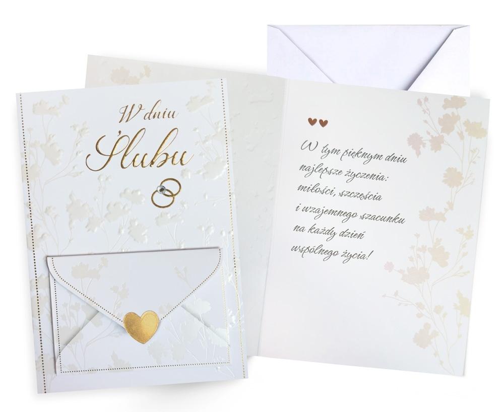 Kartka Dream Cards "W dniu ślubu" DK-1316 Kartka B6 z ozdobnej serii Dream Cards - nieduża, ale robi wrażenie dzięki atrakcyjnej kolorystyce i ciekawym zdobieniom. To idealny wybór łączący przyjazną cenę z jakością. Cechy szczególne: wielkość: B6, 16.6 x 11.7 cm po złożeniu, koperta: w zestawie, kolorowa, zdobienia: kolorowe, różnorodne, bogate (w zależności od wzoru: przyklejane dekoracje, elementy biżuteryjne, odstawniki, metaliczne folie, tłoczenia itp.), okazja: Ślub