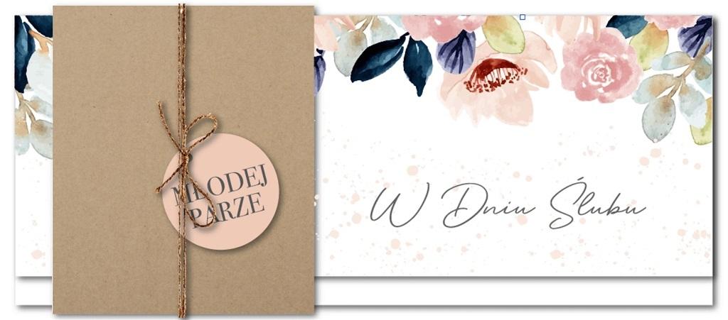 Karnet okolicznościowy z kopertą i życzeniami w środku.