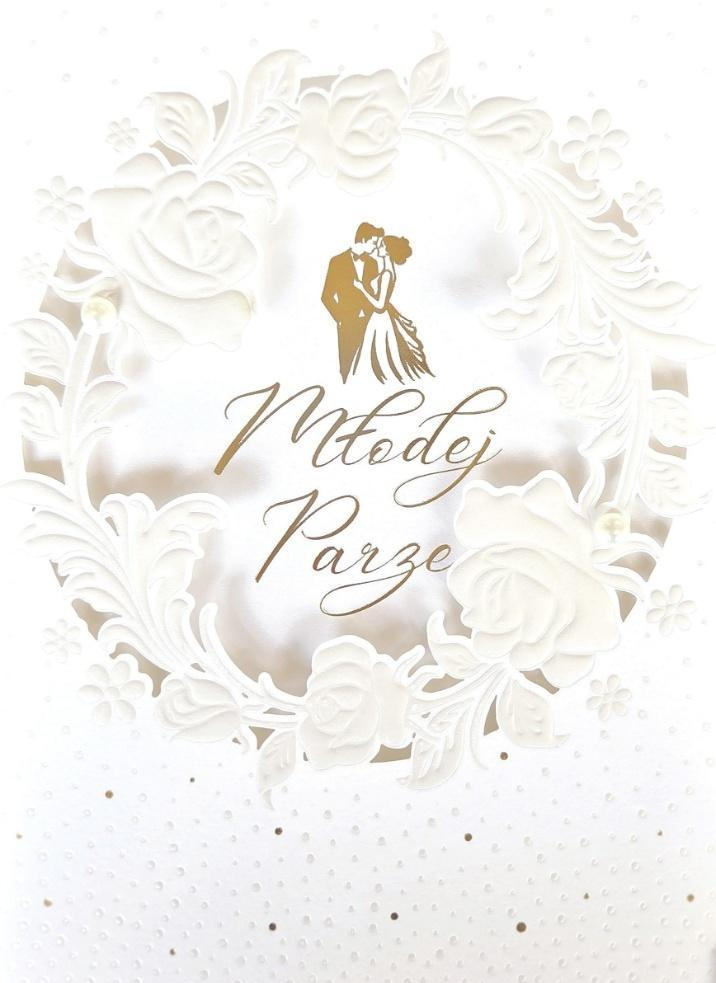 Elegancki karnet na Ślubny w formacie B6 z laserowo wycinanym wzorem. Delikatny, ażurowy motyw z symbolami ślubnymi. Wewnątrz miejsce na życzenia. Idealna pamiątka tego ważnego dnia.