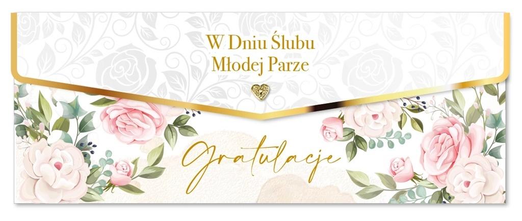Karnet okolicznościowy z kopertą i życzeniami w środku.