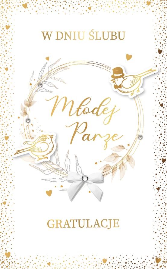 Luksusowy karnet Ślubny z elementami złocenia lub srebrzenia, wykonany na specjalnym, grubym kartonie z licznymi dodatkami.