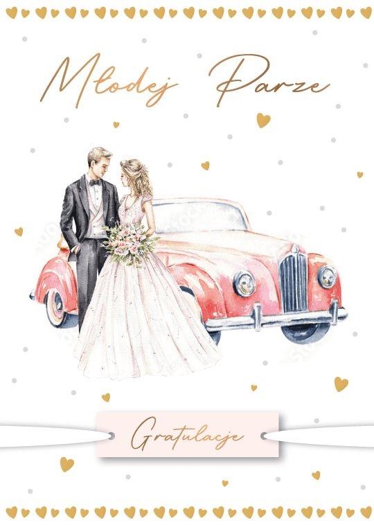 Karnet Ślubny z kopertą i tekstem wewnątrz i miejscem na osobiste życzenia.