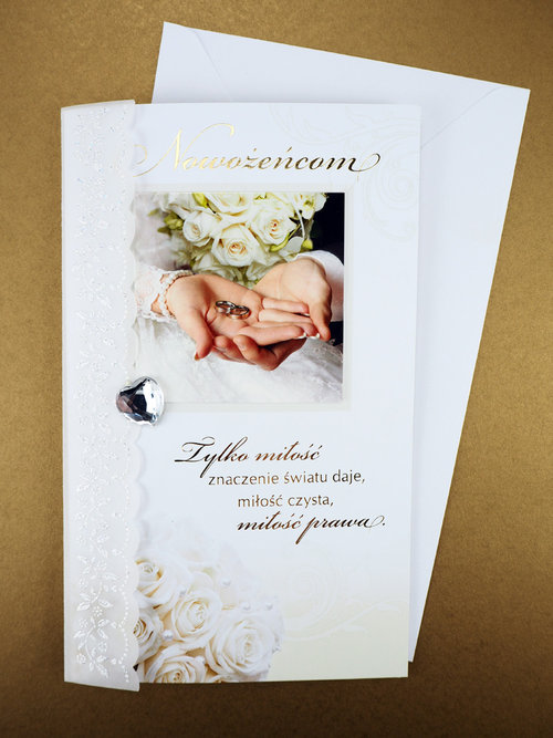 Ślubny karnet z kopertą. Elegancki w subtelnych barwach, zdobiony ażurowym wytłoczeniem. Dodatek błyszczących drobinek i aplikacji w postaci diamentowego serca nadaje całości elegancji. Wewnątrz ozdobny środek i życzenia. "Szczęśliwa Młoda Paro, w Uroczystym Dniu Ślubu Życzymy Wam miłości gorącej jak słońce, szlachetnej jak złoto, czystej jak łza i słodkiej jak miód oraz spełnienia Waszych wspólnych marzeń i planów." Format: 11,5x19 cm