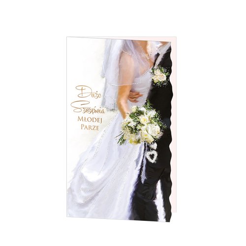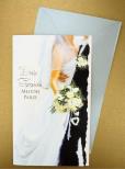 Ślubny karnet z kopertą. Elegancki w subtelnych barwach, zdobiony wytłoczeniem. Dodatek błyszczących drobinek nadaje całości elegancji. Wewnątrz ozdobny środek i życzenia. "Jeżeli kochać - to kochać stale, dopóki serce przestanie bić. I swej miłości nie wstydzić się wcale, bo bez miłości nie można żyć." Format: 11,5x19 cm