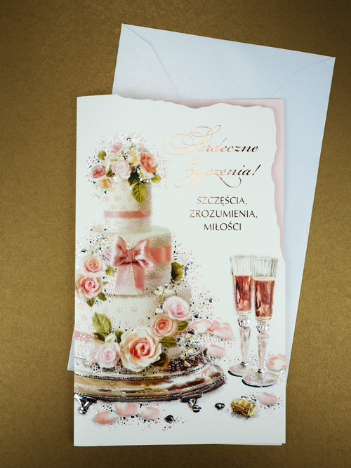 Ślubny karnet z kopertą. Elegancki w subtelnych barwach, zdobiony wytłoczeniami. Dodatek srebrnych, błyszczących drobinek nadaje całości elegancji. Wewnątrz ozdobny środek z kieszonką na pieniądze i życzenia. "Szczęśliwa Młoda Paro, w Uroczystym Dniu Ślubu Życzymy Wam miłości gorącej jak słońce, szlachetnej jak złoto, czystej jak łza i słodkiej jak miód oraz spełnienia Waszych wspólnych marzeń i planów." Format: 11,5x19 cm
