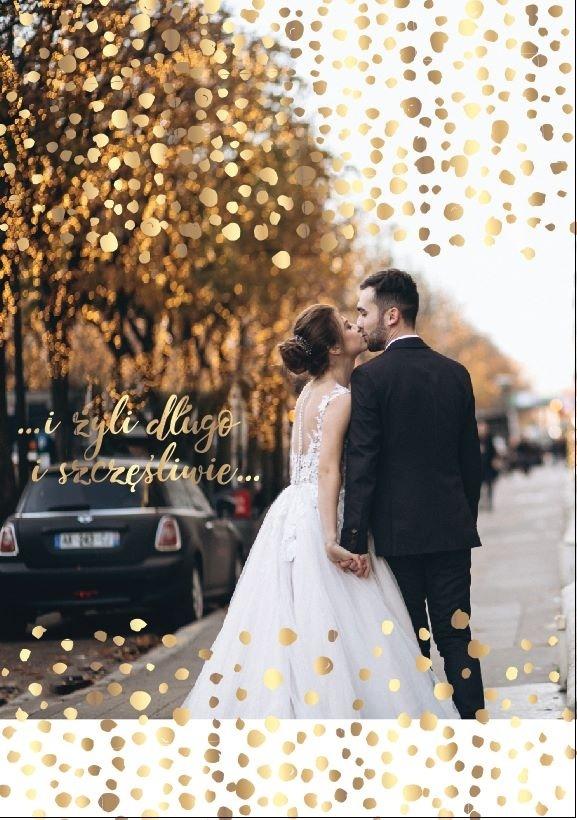 Kartka wielkości B6, zdobiona w zależności od wzoru metaliczną folią lub brokatem, kartka z tekstem w środku, kolorowa w środku i na zewnątrz.