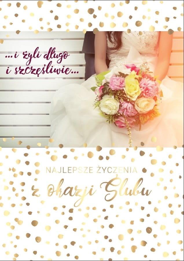 Kartka wielkości B6, zdobiona w zależności od wzoru metaliczną folią lub brokatem, kartka z tekstem w środku, kolorowa w środku i na zewnątrz.