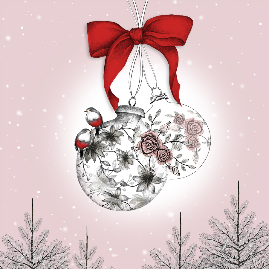 Karnet Swarovski kwadrat Święta Bombki z kokardą