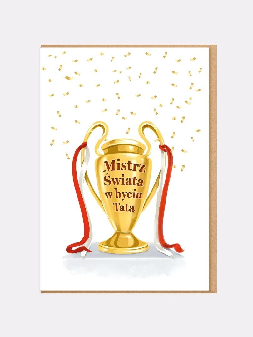 Kartka MISTRZ ŚWIATA przedstawia złoty puchar - dokładnie taki, jaki powinien trafić do kogoś naprawdę wyjątkowego. A napis mówi wszystko: "Mistrz świata w byciu tatą".