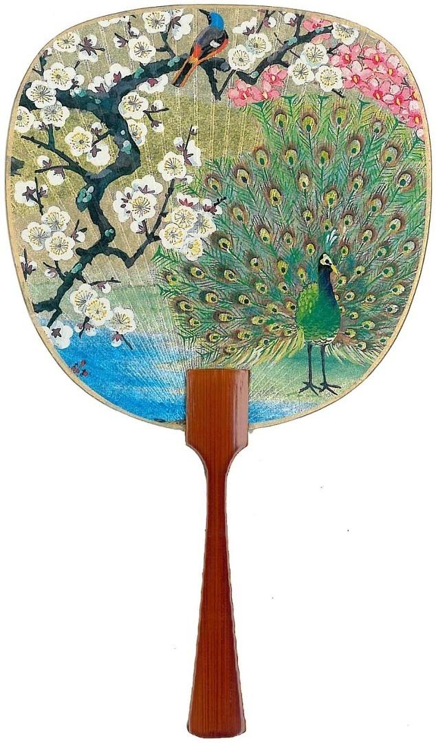 Elegancki japoński karnet premium z piękną, artystyczną ilustracją. Przedstawia tradycyjny japoński wachlarz (uchiwa) z niezwykle barwną i bogatą sceną. Na powierzchni wachlarza dumnie prezentuje się piękny paw z rozłożonym ogonem w intensywnych odcieniach zieleni, złota i błękitu. Obok niego kwitnące gałęzie wiśni w bieli i różu oraz mały kolorowy ptak na gałęzi. Karnet w zestawie z kopertą, bez tekstu w środku.