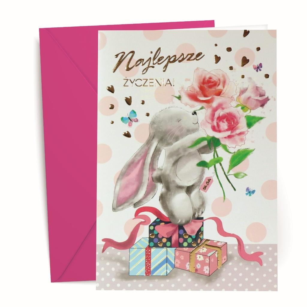 Kartka z kopertą, z życzeniami na różne okazje. Opakowana folią open.