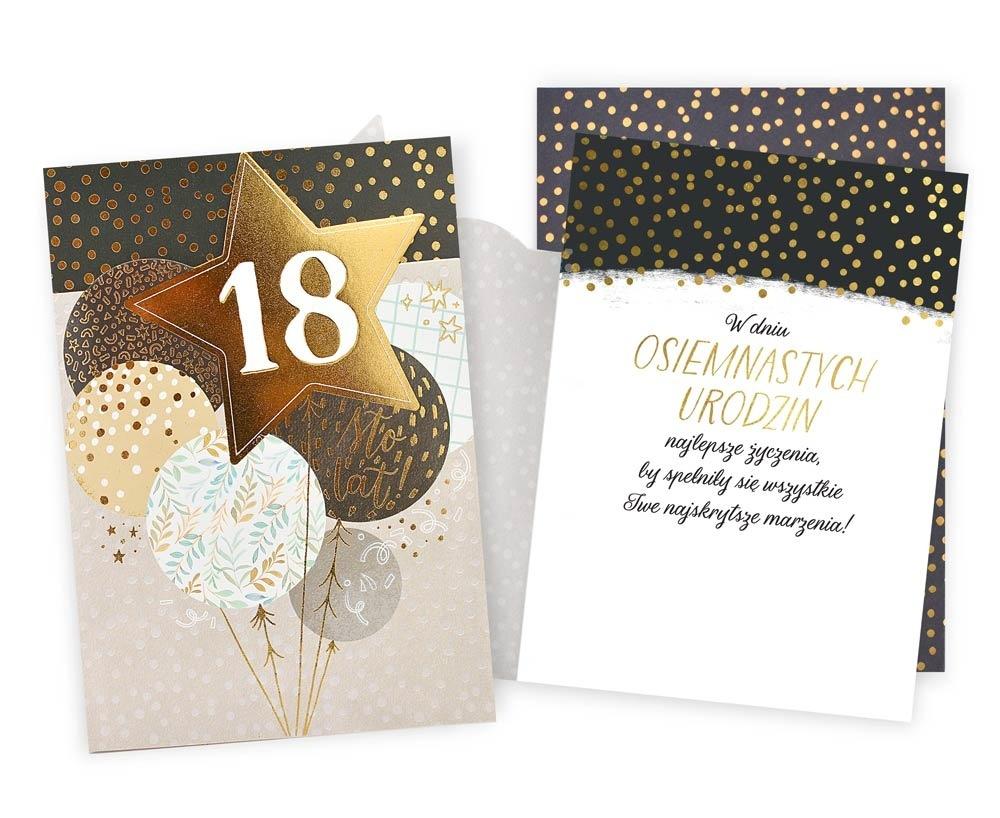 Kartka Dream Cards "Urodziny 18" DK-1249 Kartka B6 z ozdobnej serii Dream Cards - nieduża, ale robi wrażenie dzięki atrakcyjnej kolorystyce i ciekawym zdobieniom. To idealny wybór łączący przyjazną cenę z jakością. Cechy szczególne: wielkość: B6, 16.6 x 11.7 cm po złożeniu, koperta: w zestawie, kolorowa, zdobienia: kolorowe, różnorodne, bogate (w zależności od wzoru: przyklejane dekoracje, elementy biżuteryjne, odstawniki, metaliczne folie, tłoczenia itp.), okazja: osiemnastka, urodziny