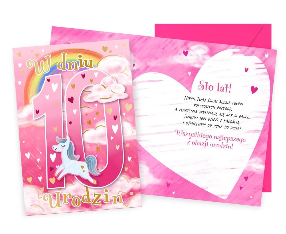 Kartka Dream Cards "W dniu 10 urodzin" DK-1258 Kartka B6 z ozdobnej serii Dream Cards - nieduża, ale robi wrażenie dzięki atrakcyjnej kolorystyce i ciekawym zdobieniom. To idealny wybór łączący przyjazną cenę z jakością. Cechy szczególne: wielkość: B6, 16.6 x 11.7 cm po złożeniu, koperta: w zestawie, kolorowa, zdobienia: kolorowe, różnorodne, bogate (w zależności od wzoru: przyklejane dekoracje, elementy biżuteryjne, odstawniki, metaliczne folie, tłoczenia itp.), okazja: urodziny