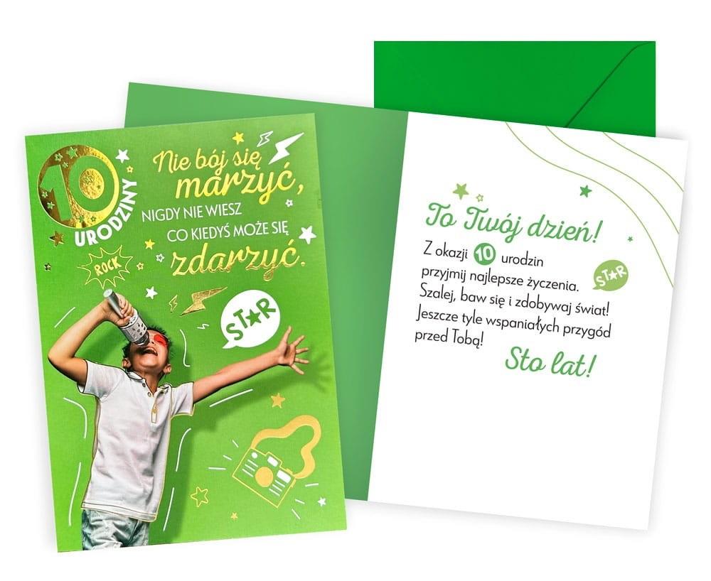 W powiększonym tzw. Angielskim formacie 140x190 mm. Wykonany z niezwykłą dbałością o szczegóły, zdobiony. Wewnątrz znajduje się tekst życzeń, a całość uzupełnia dopasowana kolorystycznie koperta. okazja: Urodziny