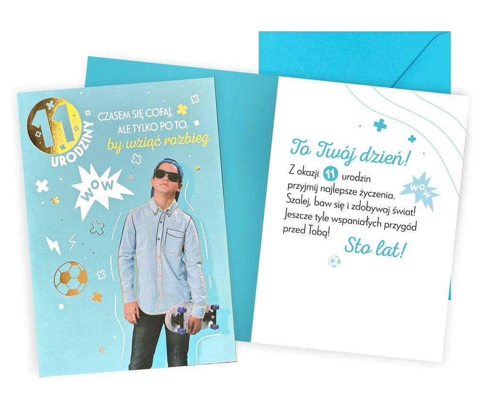 W powiększonym tzw. Angielskim formacie 140x190 mm. Wykonany z niezwykłą dbałością o szczegóły, zdobiony. Wewnątrz znajduje się tekst życzeń, a całość uzupełnia dopasowana kolorystycznie koperta. okazja: Urodziny