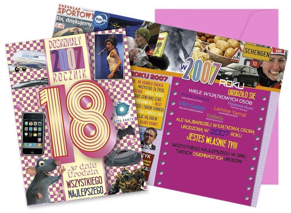 Karnet Vision "Urodziny 18" V-116 Kartka z serii To Był Rok, w której w środku i na froncie znajdują się ciekawe wydarzenia z danego roku. Wykonane z niezwykłą dbałością o szczegóły, zdobione folią holograficzną i w całości pokryte folią matową dla podkreślenia efektu prostoty i elegancji. Każdy karnet zawiera w środku starannie dobrane życzenia oraz dopasowaną kopertę. W powiększonym formacie 140x190 mm. Cechy szczegółowe: wnętrze: kolorowe, wyjątkowe życzenia w środku, w komplecie: dopasowana kolorystycznie koperta. wymiary kartki 14 x 19 cm okazja: 18 urodziny.