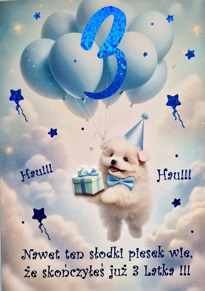 Karnet 3K to bogato zdobiony karnet z elementem naklejanym oraz złoceniem. Karnet to doskonały dodatek do prezentu. Karnet zawiera również zabawne życzenia.