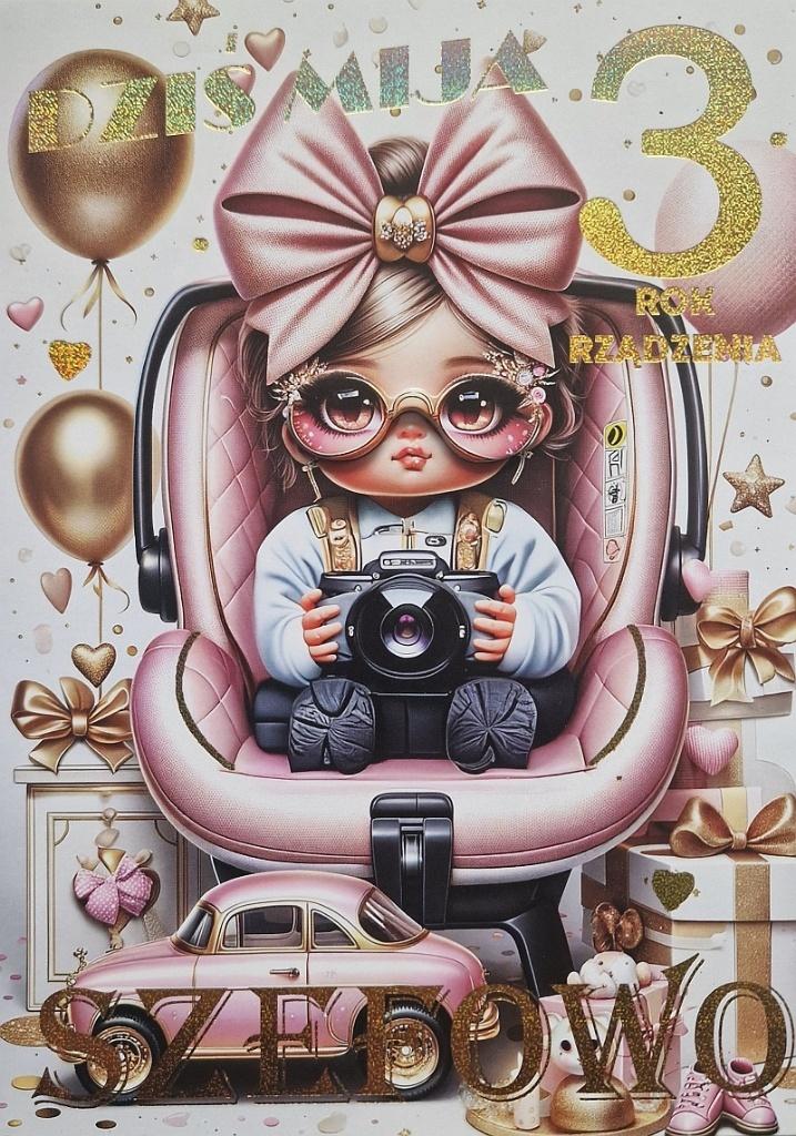 Karnet 3K to bogato zdobiony karnet z elementem naklejanym oraz złoceniem. Karnet to doskonały dodatek do prezentu. Karnet zawiera również zabawne życzenia.