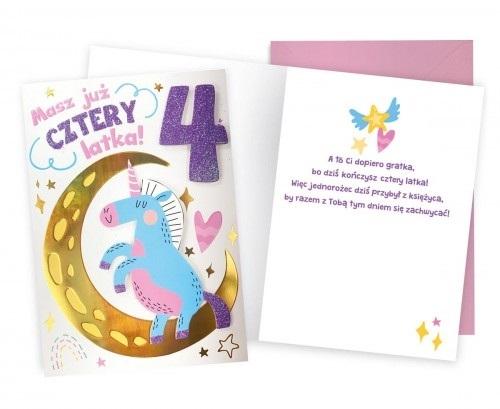 Karnet Dream Cards Plus "Urodziny 4" DKP-038 w powiększonym tzw. Angielskim formacie 140x190 mm. Kartka z ozdobnej serii Dream Cards Plus na czwarte urodziny robi wrażenie dzięki atrakcyjnej kolorystyce i ciekawym zdobieniom. To idealny wybór łączący przyjazną cenę z jakością. Cechy szczególne: wielkość: 145 x 195 cm po złożeniu kopertą, wnętrze: kolorowe, wyjątkowe życzenia w środku, w komplecie: dopasowana kolorystycznie koperta. zdobienia: różnorodne, bogate (w zależności od wzoru: przyklejane dekoracje, elementy biżuteryjne, odstawniki, brokat, metaliczne folie, tłoczenia itp.), okazja: urodziny, 4 urodziny