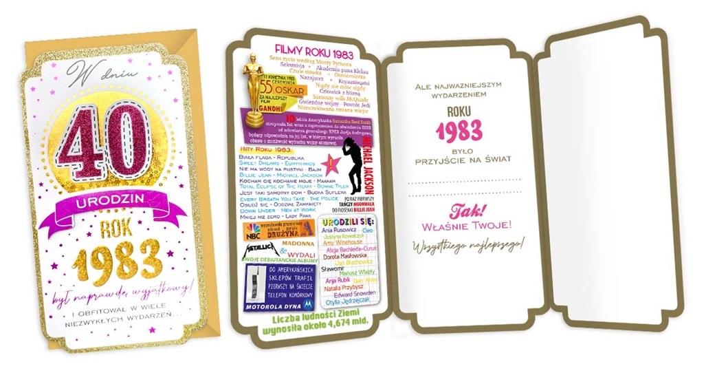Kartki z serii Roczniki Passion Moments to zdobione kartki, w których w środku znajdują się ciekawe wydarzenia z danego roku. Na kartce znajdują się dekoracje ze złotej, srebrnej, perłowej lub holograficznej folii, a także doklejki biżuteryjne, kokardki, brokat, laserowe wycięcia, wstążeczki i inne dodatki. Wnętrze karnetu to zawsze atrakcyjna grafika i tekst życzeń. zdobienie: przynajmniej dwie folie (metaliczne/perłowe/holograficzne), brokat, elementy doklejane, wycięcia laserowe, wstążeczki - w zależności od wzoru, wnętrze: kolorowe, z delikatną grafiką, wyjątkowe życzenia w środku, w komplecie: dopasowana kolorystycznie koperta.