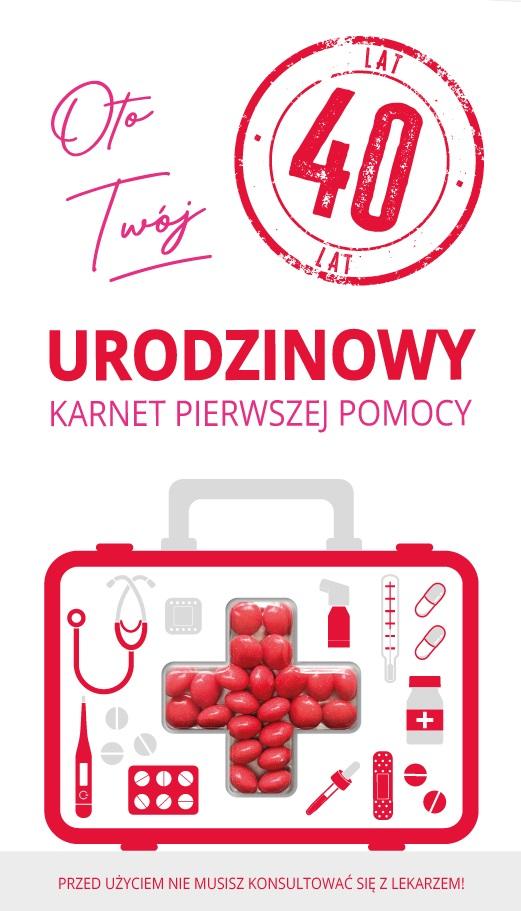 Karnet z okazji 40 urodzin z życzeniami, kopertą i humorystycznym dodatkiem w środku.
