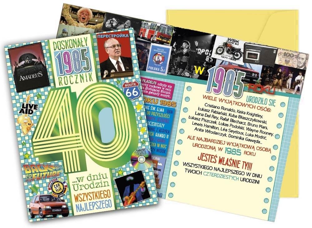 Karnet Vision "Urodziny 40" V-118 Kartka z serii To Był Rok, w której w środku i na froncie znajdują się ciekawe wydarzenia z danego roku. Wykonane z niezwykłą dbałością o szczegóły, zdobione folią holograficzną i w całości pokryte folią matową dla podkreślenia efektu prostoty i elegancji. Każdy karnet zawiera w środku starannie dobrane życzenia oraz dopasowaną kopertę. W powiększonym formacie 140x190 mm. Cechy szczegółowe: wnętrze: kolorowe, wyjątkowe życzenia w środku, w komplecie: dopasowana kolorystycznie koperta. wymiary kartki 14 x 19 cm okazja: urodziny