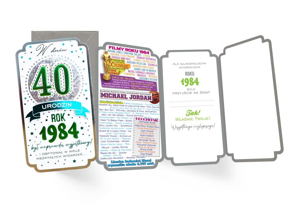 Kartki z serii Roczniki Passion Moments to zdobione kartki, w których w środku znajdują się ciekawe wydarzenia z danego roku. Na kartce znajdują się dekoracje ze złotej, srebrnej, perłowej lub holograficznej folii, a także doklejki biżuteryjne, kokardki, brokat, laserowe wycięcia, wstążeczki i inne dodatki. Wnętrze karnetu to zawsze atrakcyjna grafika i tekst życzeń. zdobienie: przynajmniej dwie folie (metaliczne/perłowe/holograficzne), brokat, elementy doklejane, wycięcia laserowe, wstążeczki - w zależności od wzoru, wnętrze: kolorowe, z delikatną grafiką, wyjątkowe życzenia w środku, w komplecie: dopasowana kolorystycznie koperta