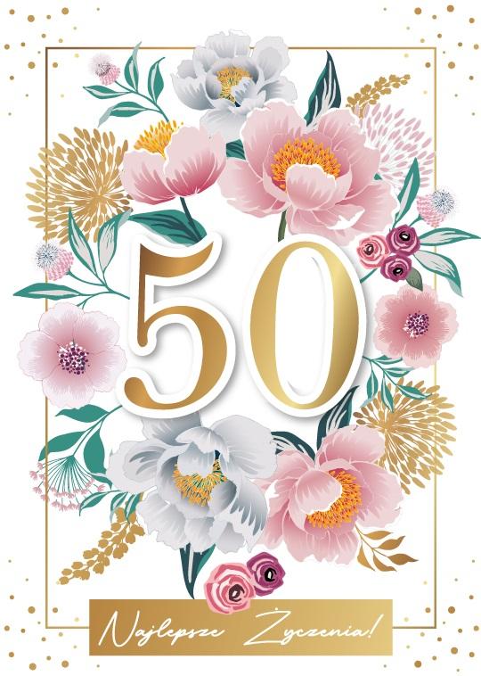 Karnet z okazji 50 urodzin z życzeniami i kopertą w środku.